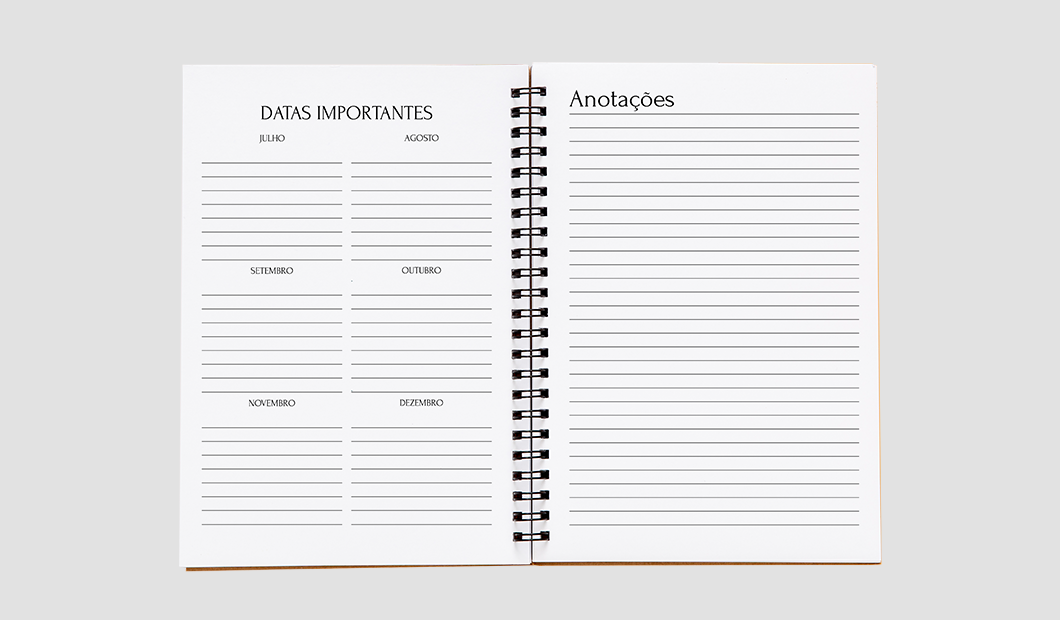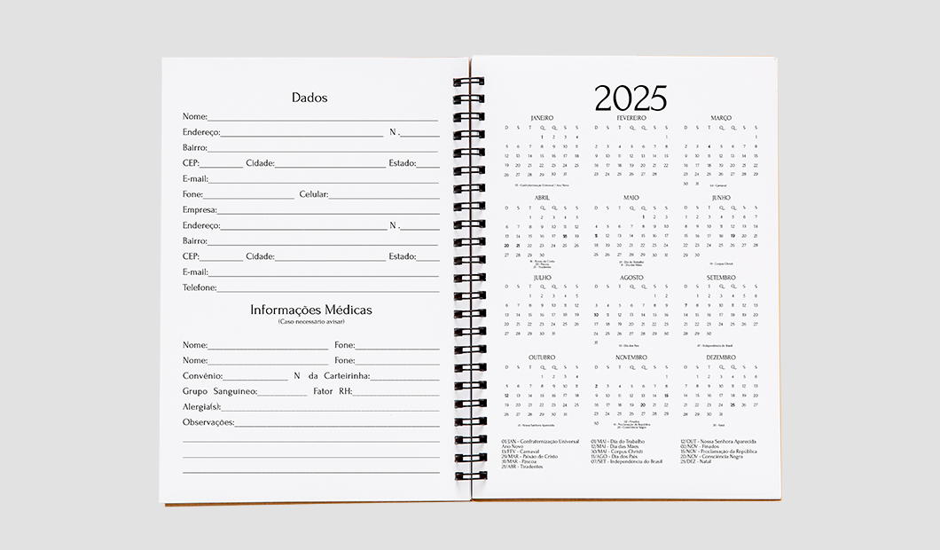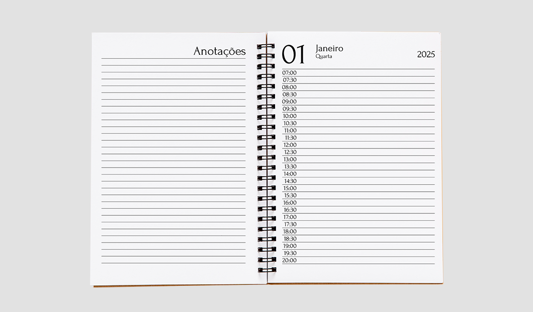 Extremamente úteis no dia a dia corporativo, as agendas pessoais podem ser distribuídas internamente aos colaboradores, ou externamente, como brinde à clientes, fornecedores, prestadores de serviços entre outros. É uma maneira simples, elegante e funcional de se divulgar uma marca.
